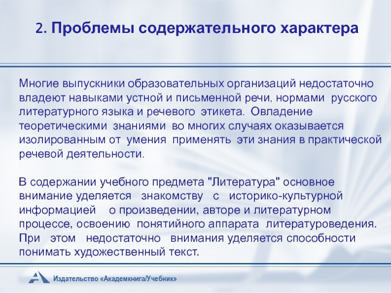 В содержании учебного предмета "Литература" основное внимание уделяется знакомству с историко-культурной информацией о произведении, авторе и литературном процессе, освоению понятийного аппарата литературоведения. При этом недостаточно внимания уделяется способности понимать художественный текст.