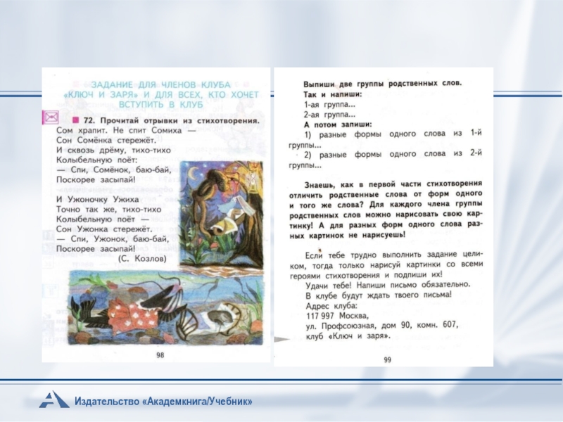 В учебниках русского языка и литературного чтения школьников приглашает к активной деятельности в течение каждой учебной четверти клуб «КЛЮЧ И ЗАРЯ».