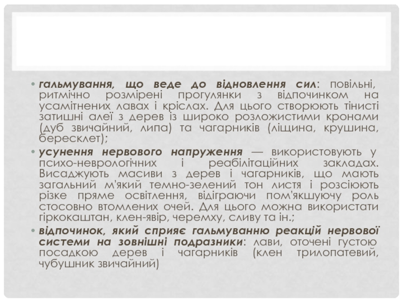 усунення нервового напруження — використовують у психо-неврологічних і реабілітаційних закладах. Висаджують масиви з дерев і чагарників, що мають загальний м'який темно-зелений тон листя і розсіюють різке пряме освітлення, відіграючи пом'якшуючу роль стосовно втомлених очей. Для цього можна використати гіркокаштан, клен-явір, черемху, сливу та ін.;