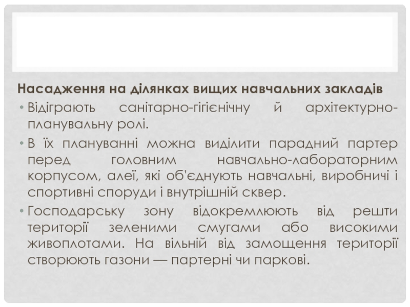 Слайд 9Насадження на ділянках вищих навчальних закладів