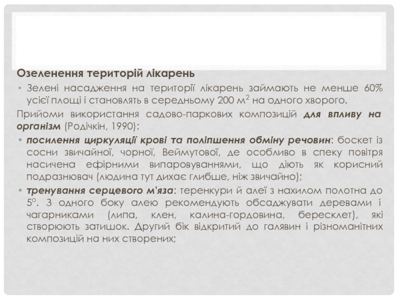 Прийоми використання садово-паркових композицій для впливу на організм (Родічкін, 1990):