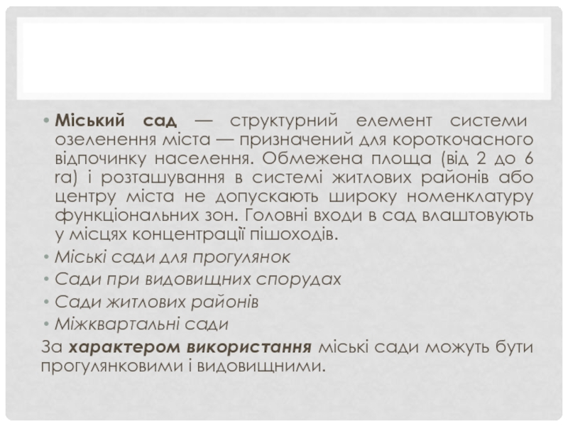 Слайд 5Міський сад — структурний елемент системи озеленення міста — призначений