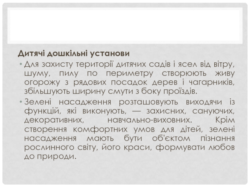 Зелені насадження розташовують виходячи із функцій, які виконують, — захисних, сануючих, декоративних, навчально-виховних. Крім створення комфортних умов для дітей, зелені насадження мають бути об'єктом пізнання рослинного світу, його краси, формувати любов до природи.