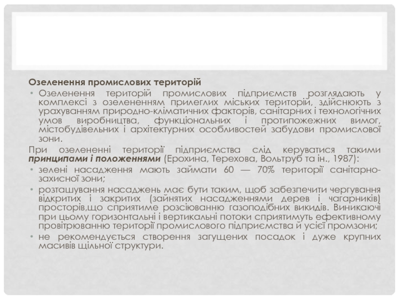 При озелененні території підприємства слід керуватися такими принципами і положеннями (Ерохина, Терехова, Вольтруб та ін., 1987):