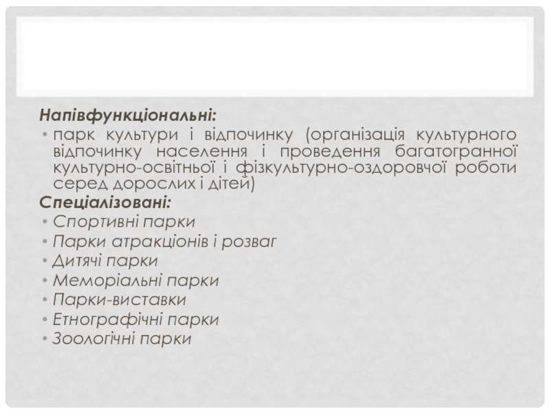 Міські парки поділяють на напівфункціональні і спеціалізовані.