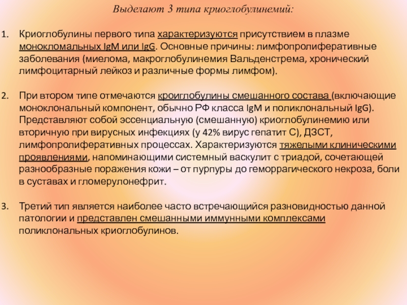 Слайд 18Выделают 3 типа криоглобулинемий:
