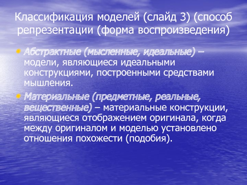 Слайд 9Классификация моделей (слайд 3) (способ репрезентации (форма воспроизведения)