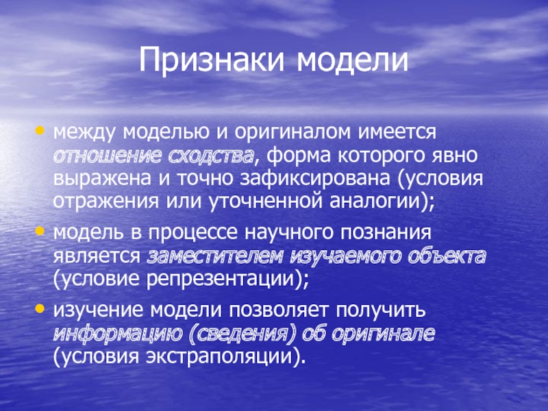 в процессе научного познания является заместителем изучаемого объекта (условие репрезентации);