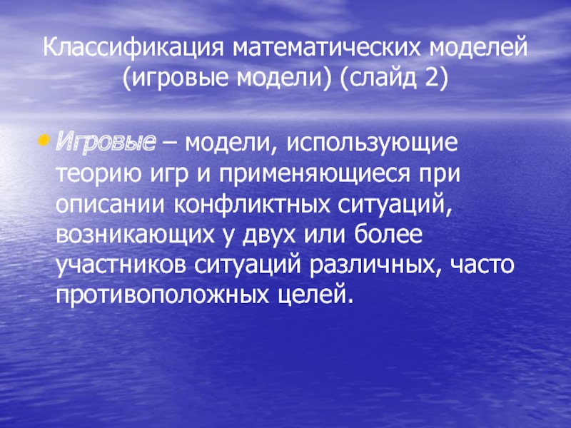 Слайд 14Игровые – модели, использующие теорию игр и применяющиеся при описании