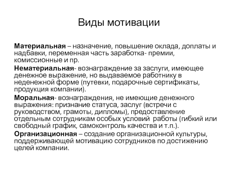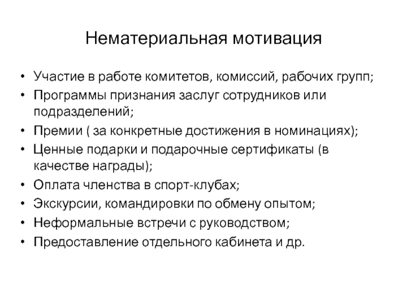 Моральная- вознаграждения, не имеющие денежного выражения: признание статуса, заслуг (встречи с руководством, грамоты, дипломы), предоставление отдельным сотрудникам особых условий работы (гибкий или свободный график, самоконтроль качества и т.п.).