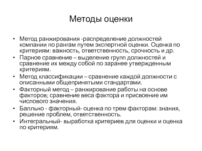Факторный метод – ранжирование работы на основе факторов; сравнение веса фактора и присвоение им числового значения.