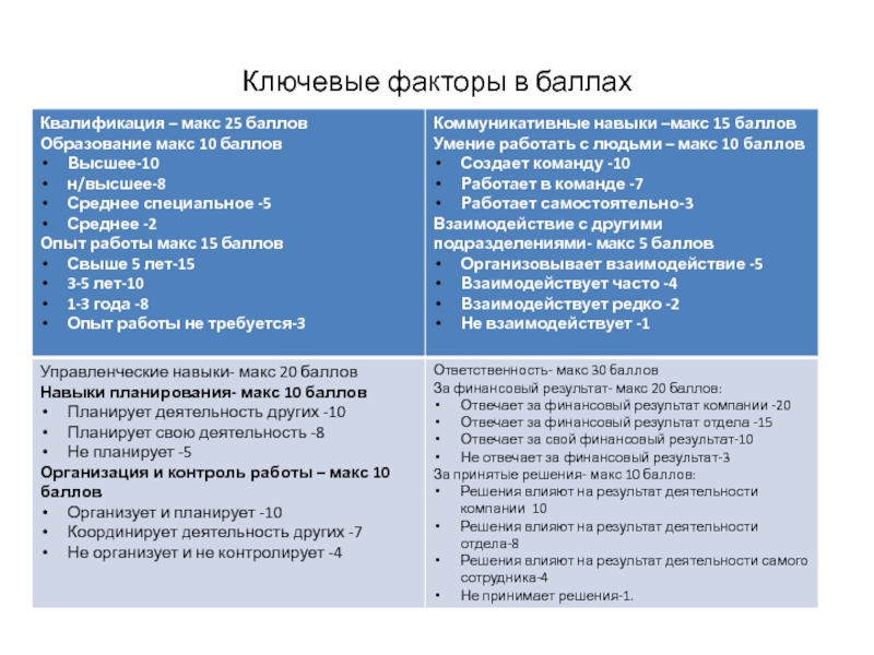 Балльно - факторный- оценка по трем факторам: знания, решение проблем, ответственность.