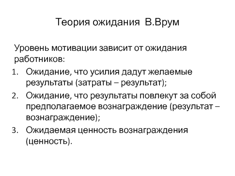 Ожидания результат- вознаграждение связано с вопросом: приведет ли эффективная деятельность позволит получить ему желаемые выгоды;
