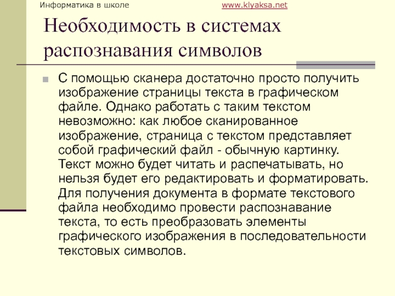 Необходимость в системах распознавания символовС помощью сканера достаточно просто получить изображение страницы текста в графическом файле. Однако