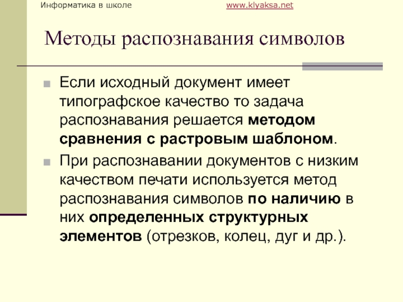 Методы распознавания символовЕсли исходный документ имеет типографское качество то задача распознавания решается методом сравнения с растровым шаблоном.