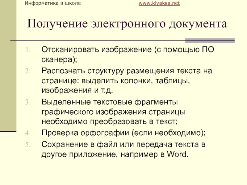 Получение электронного документаОтсканировать изображение (с помощью ПО сканера);Распознать структуру размещения текста на странице: выделить колонки, таблицы, изображения