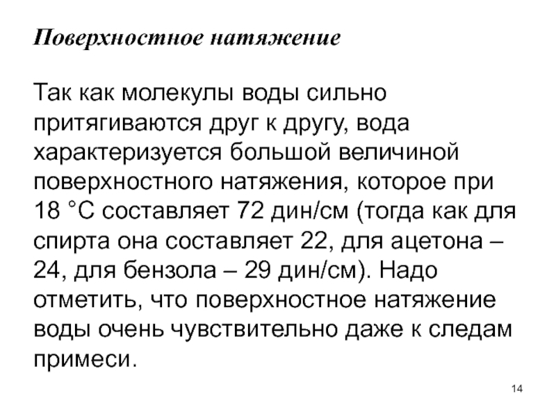 °С составляет 72 дин/см (тогда как для спирта она составляет 22, для ацетона – 24, для бензола – 29 дин/см). Надо отметить, что поверхностное натяжение воды очень чувствительно даже к следам примеси.