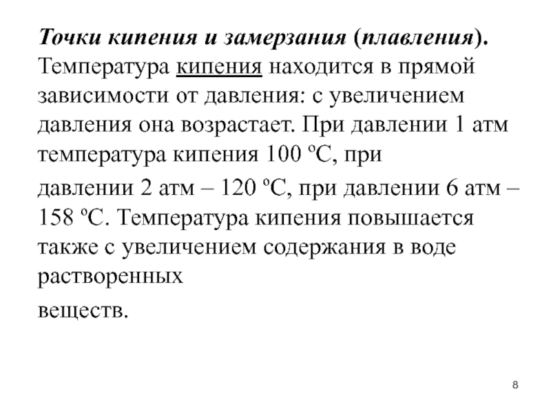 давлении 2 атм – 120 ºС, при давлении 6 атм – 158 ºС. Температура кипения повышается также с увеличением содержания в воде растворенных