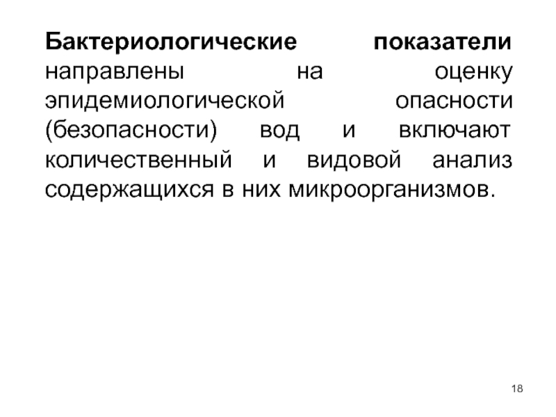 Слайд 18Бактериологические показатели направлены на оценку эпидемиологической опасности (безопасности) вод и
