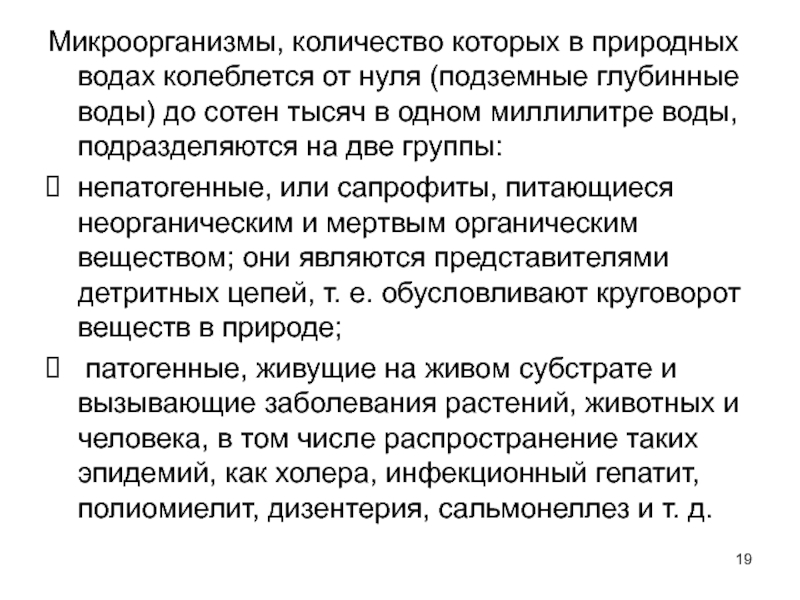 Слайд 19Микроорганизмы, количество которых в природных водах колеблется от нуля (подземные