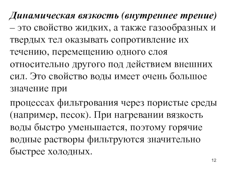 Слайд 12Динамическая вязкость (внутреннее трение) – это свойство жидких, а также
