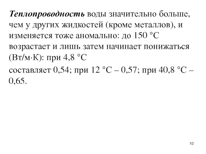Слайд 10Теплопроводность воды значительно больше, чем у других жидкостей (кроме металлов),