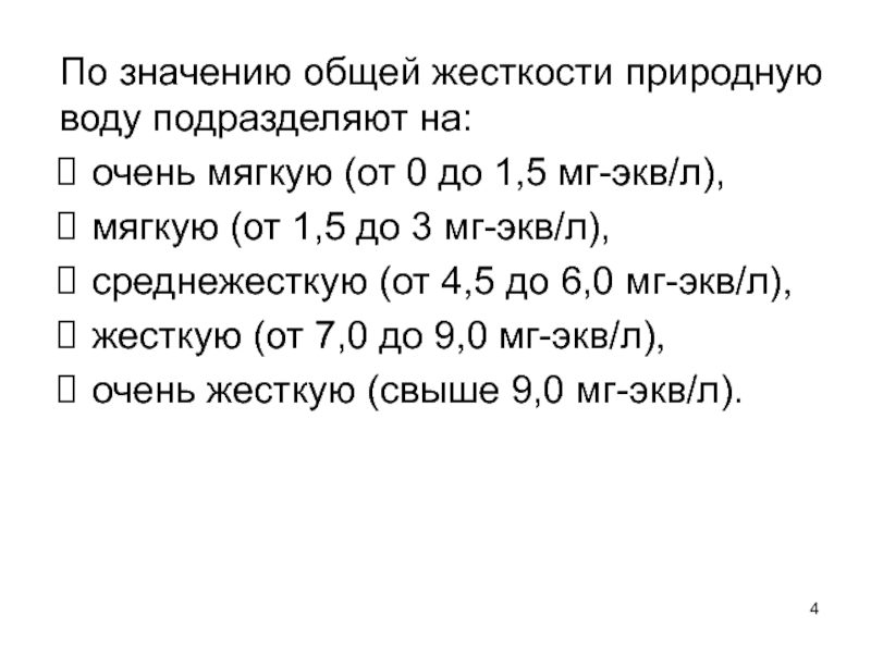 Слайд 4По значению общей жесткости природную воду подразделяют на: