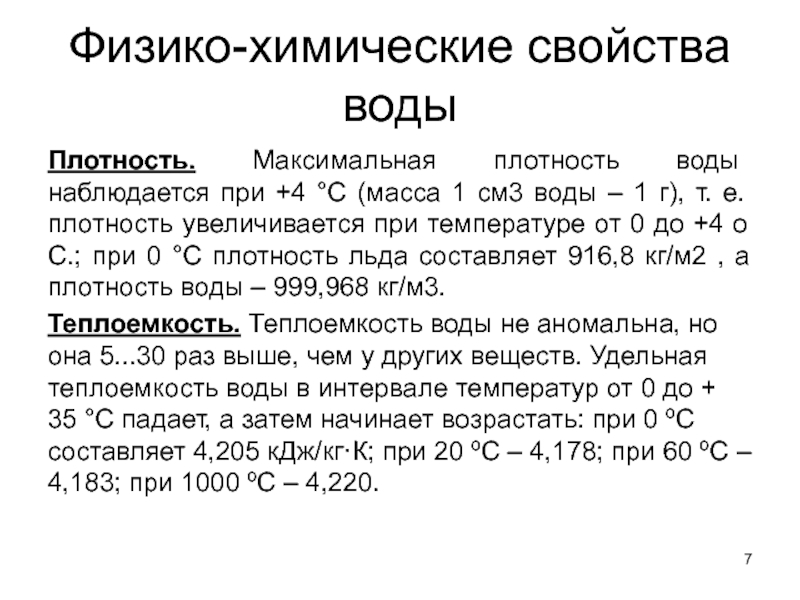 Теплоемкость. Теплоемкость воды не аномальна, но она 5...30 раз выше, чем у других веществ. Удельная теплоемкость воды в интервале температур от 0 до + 35 °С падает, а затем начинает возрастать: при 0 ºС составляет 4,205 кДж/кг·К; при 20 ºС – 4,178; при 60 ºС – 4,183; при 1000 ºС – 4,220.