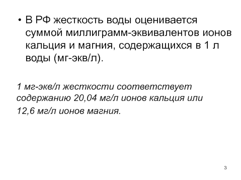 Слайд 3В РФ жесткость воды оценивается суммой миллиграмм-эквивалентов ионов кальция и