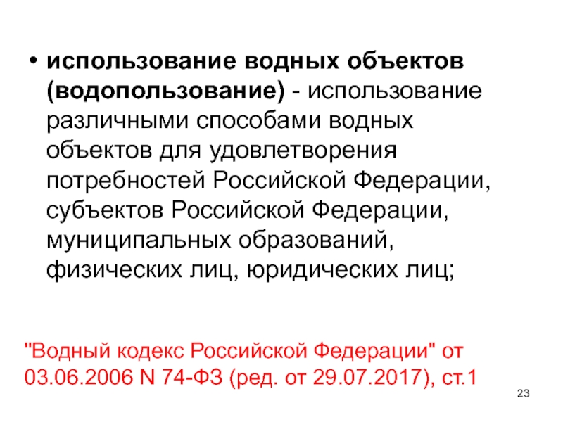 Слайд 23использование водных объектов (водопользование) - использование различными способами водных объектов