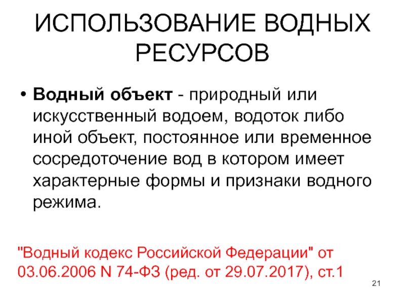 Слайд 21Водный объект - природный или искусственный водоем, водоток либо иной