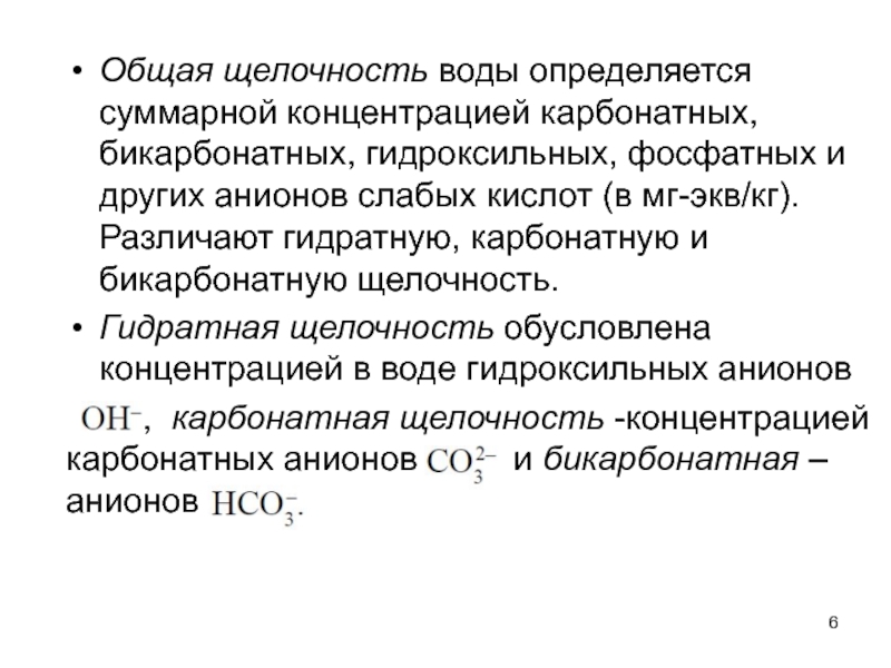 Слайд 6Общая щелочность воды определяется суммарной концентрацией карбонатных, бикарбонатных, гидроксильных, фосфатных
