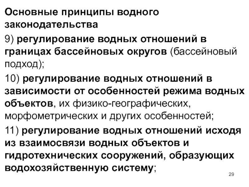 11) регулирование водных отношений исходя из взаимосвязи водных объектов и гидротехнических сооружений, образующих водохозяйственную систему;