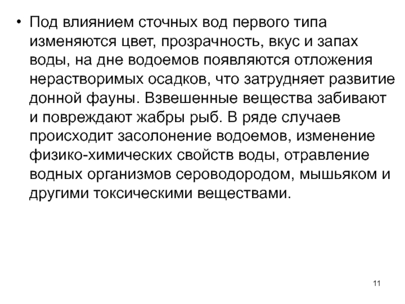 Слайд 11Под влиянием сточных вод первого типа изменяются цвет, прозрачность, вкус
