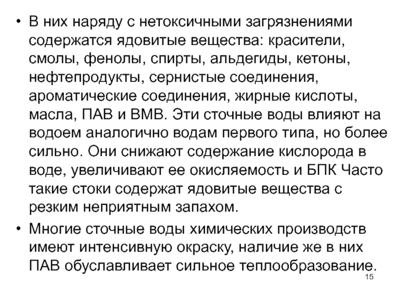 жирные кислоты, масла, ПАВ и ВМВ. Эти сточные воды влияют на водоем аналогично водам первого типа, но более сильно. Они снижают содержание кислорода в воде, увеличивают ее окисляемость и БПК Часто такие стоки содержат ядовитые вещества с резким неприятным запахом.