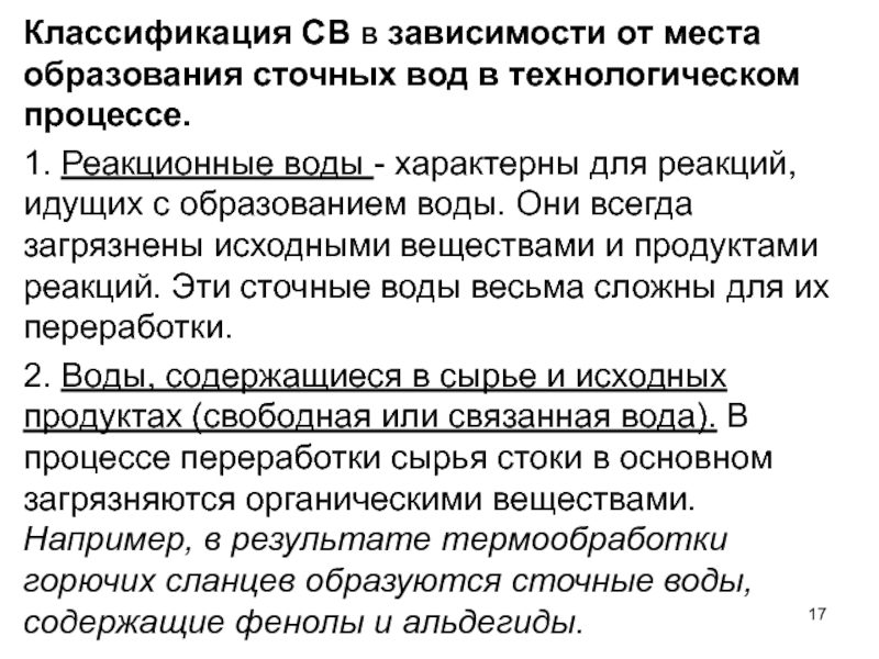 Слайд 17Классификация СВ в зависимости от места образования сточных вод в