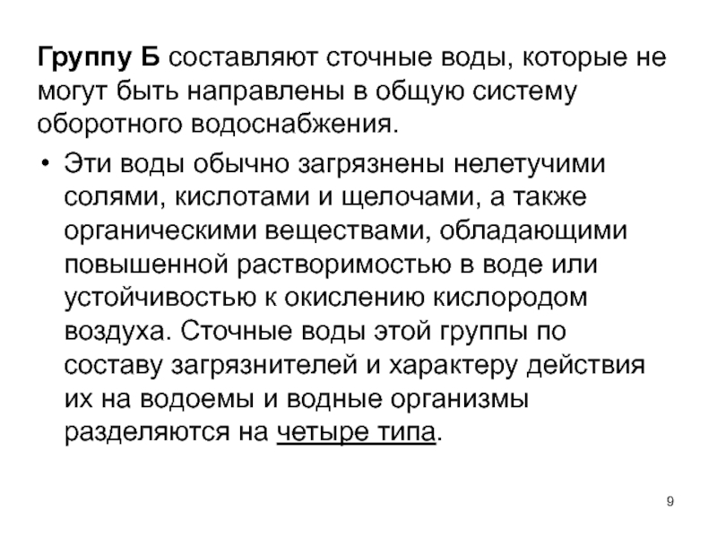Слайд 9Группу Б составляют сточные воды, которые не могут быть направлены