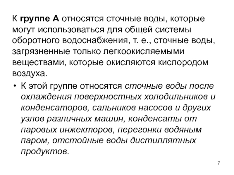 Слайд 7К группе А относятся сточные воды, которые могут использоваться для