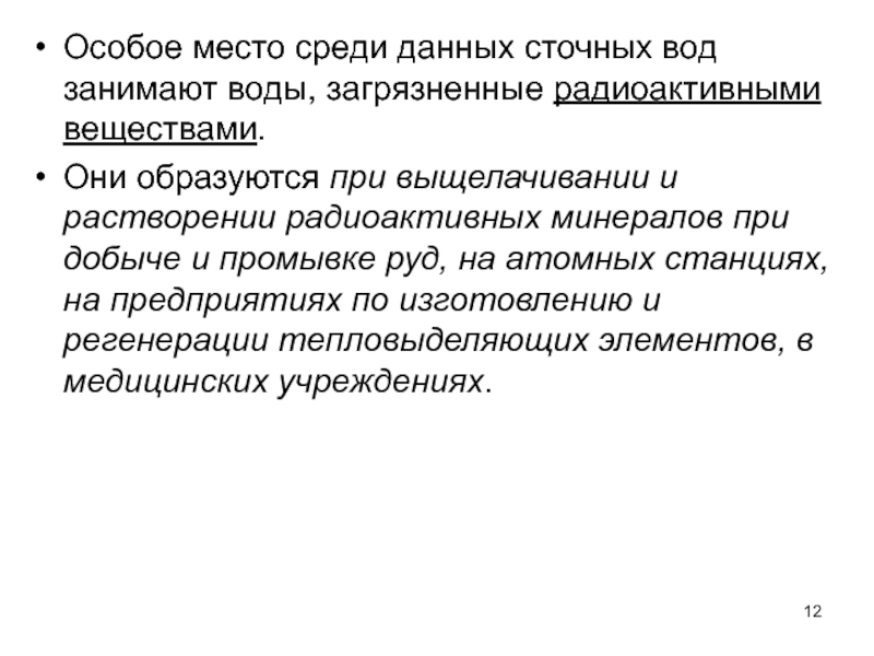Слайд 12Особое место среди данных сточных вод занимают воды, загрязненные радиоактивными