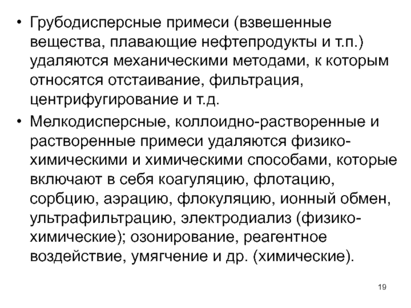 Слайд 19Грубодисперсные примеси (взвешенные вещества, плавающие нефтепродукты и т.п.) удаляются механическими
