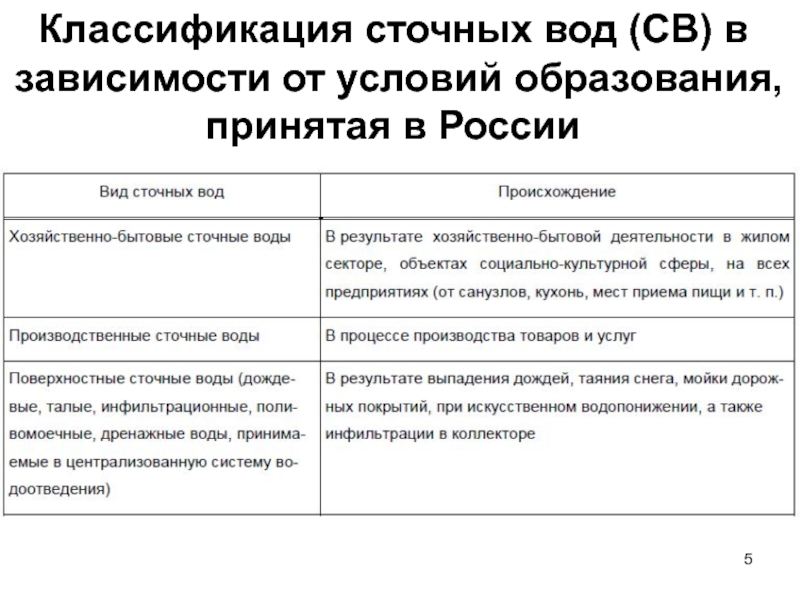 Слайд 5Классификация сточных вод (СВ) в зависимости от условий образования, принятая