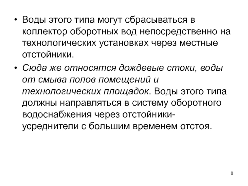 Слайд 8Воды этого типа могут сбрасываться в коллектор оборотных вод непосредственно