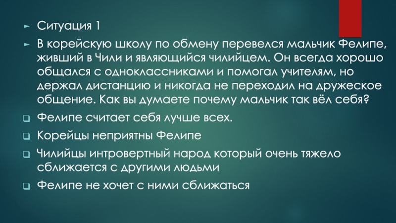 одноклассниками и помогал учителям, но держал дистанцию и никогда не переходил на дружеское общение. Как вы думаете почему мальчик так вёл себя?Фелипе считает себя лучше всех.