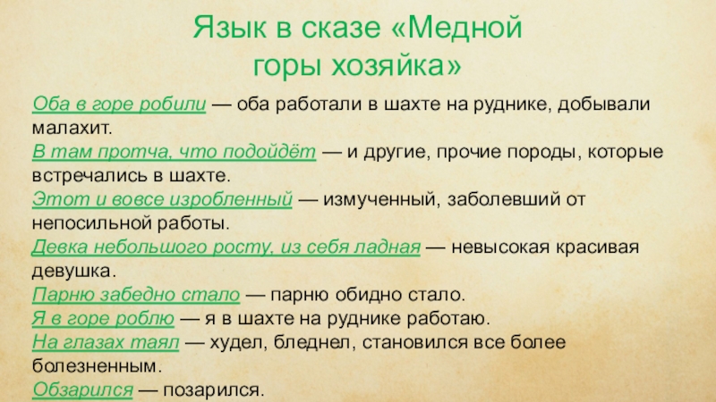 Язык в сказе «Медной горы хозяйка»Оба в горе робили — оба работали в шахте на руднике, добывали малахит.B там