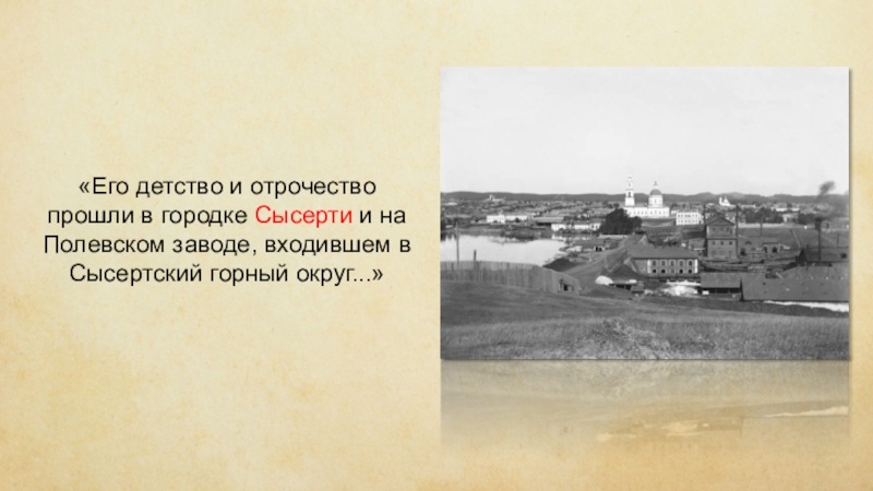 Слайд 3«Его детство и отрочество прошли в городке Сысерти и на