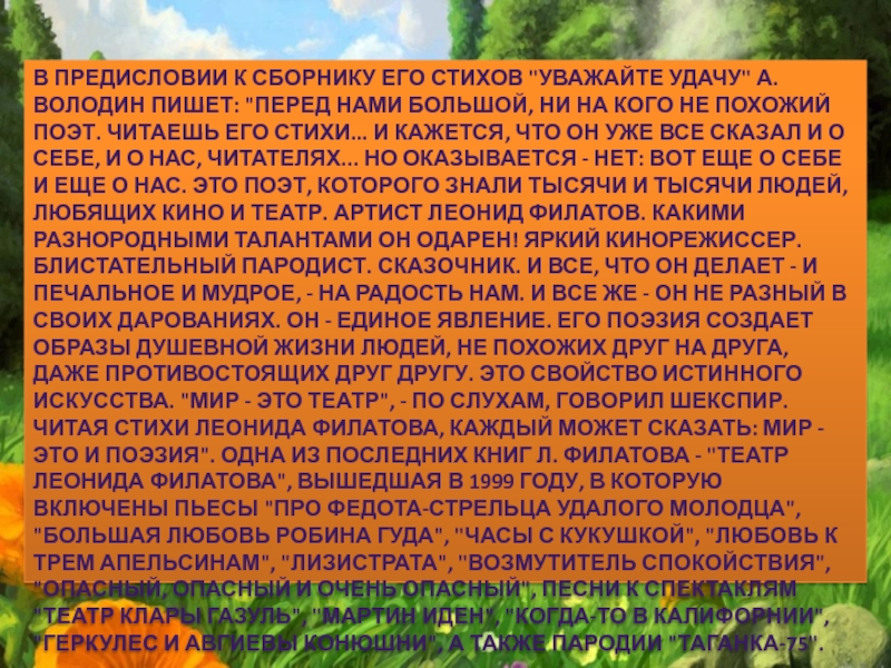 Читаешь его стихи... и кажется, что он уже все сказал и о себе, и о нас, читателях... Но оказывается - нет: вот еще о себе и еще о нас. Это Поэт, которого знали тысячи и тысячи людей, любящих кино и театр. Артист Леонид Филатов. Какими разнородными талантами он одарен! Яркий кинорежиссер. Блистательный пародист. Сказочник. И все, что он делает - и печальное и мудрое, - на радость нам. И все же - он не разный в своих дарованиях. Он - единое явление. Его поэзия создает образы душевной жизни людей, не похожих друг на друга, даже противостоящих друг другу. Это свойство истинного искусства. "Мир - это театр", - по слухам, говорил Шекспир. Читая стихи Леонида Филатова, каждый может сказать: мир - это и поэзия". Одна из последних книг Л. Филатова - "Театр Леонида Филатова", вышедшая в 1999 году, в которую включены пьесы "Про Федота-стрельца удалого молодца", "Большая любовь Робина Гуда", "Часы с кукушкой", "Любовь к трем апельсинам", "Лизистрата", "Возмутитель спокойствия", "Опасный, опасный и очень опасный", песни к спектаклям "Театр Клары Газуль", "Мартин Иден", "Когда-то в Калифорнии", "Геркулес и Авгиевы конюшни", а также пародии "Таганка-75".