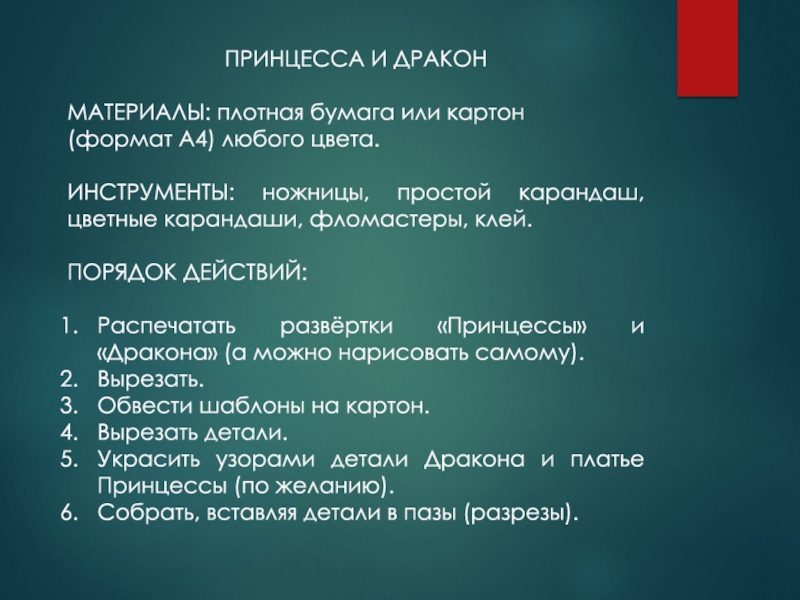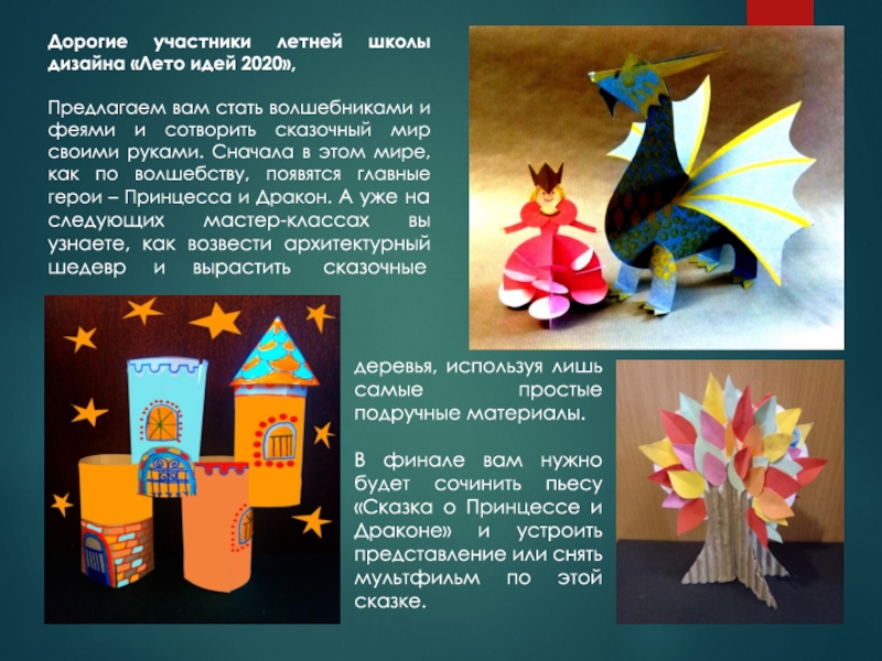 В финале вам нужно будет сочинить пьесу «Сказка о Принцессе и Драконе» и устроить представление или снять мультфильм по этой сказке.