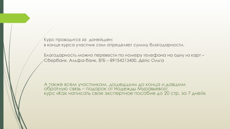 Благодарность можно перевести по номеру телефона на одну из карт – Сбербанк, Альфа-банк, ВТБ – 89154213400. Дейс Ольга