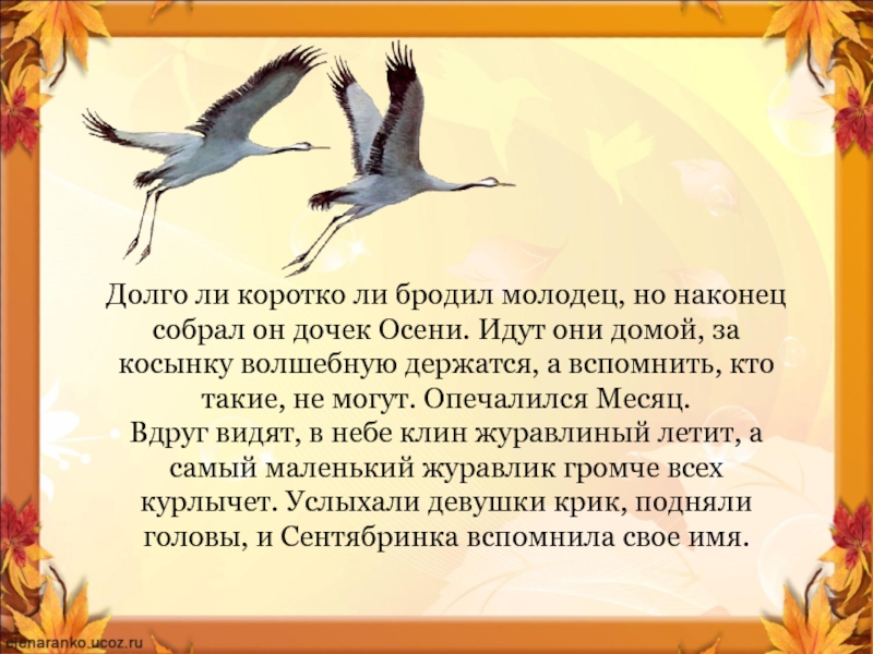 Вдруг видят, в небе клин журавлиный летит, а самый маленький журавлик громче всех курлычет. Услыхали девушки крик, подняли головы, и Сентябринка вспомнила свое имя.