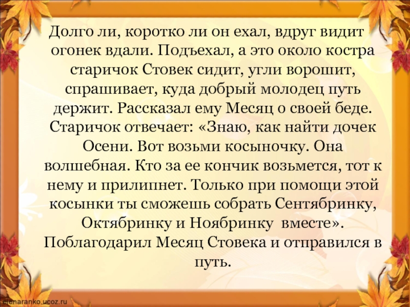 спрашивает, куда добрый молодец путь держит. Рассказал ему Месяц о своей беде. Старичок отвечает: «Знаю, как найти дочек Осени. Вот возьми косыночку. Она волшебная. Кто за ее кончик возьмется, тот к нему и прилипнет. Только при помощи этой косынки ты сможешь собрать Сентябринку, Октябринку и Ноябринку вместе». Поблагодарил Месяц Стовека и отправился в путь.